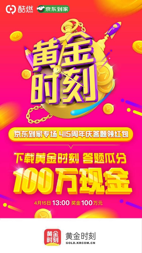直播问答节目《黄金时刻》上线以来,受到了市场和广大用户的关注和认可。在上线刚满1个月之后,《黄金时刻》就成功打造了首个商业合作案例。据了解,京东到家在4月15日创办三周年之际,京东到家独家合作《黄金时刻》专场,推出了415三周年直播答题领红包活动。