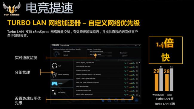 在电竞网络方面,这款主板板载疾速Intel千兆网卡,其CPU占用率更低,能提供更佳的TCP和UDP传输性能,降低处理器的工作负载,进而让游戏运行更加流畅、稳定。此外,该系列主板还拥有TURBO LAN网络加速大师,其支持cFosSpeed流量管制技术,玩家可通过直观的界面自行调节设置网络优先级,有效降低游戏延迟,令游戏体验更流畅。