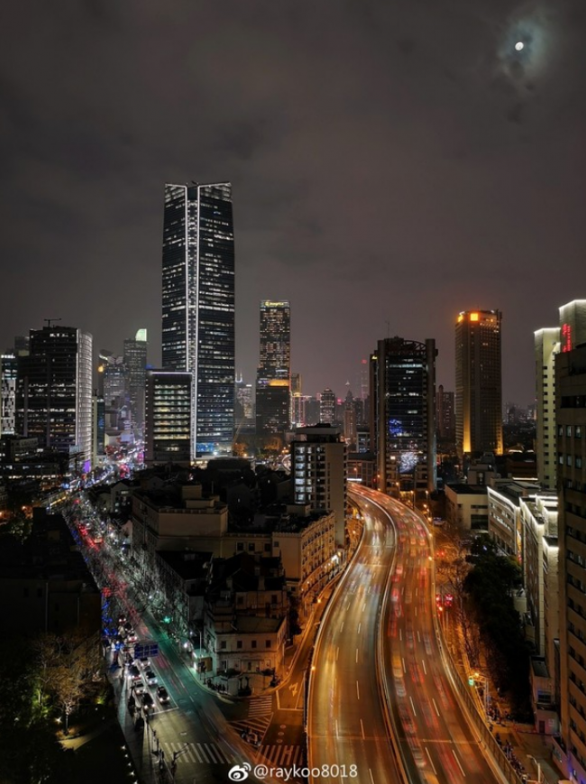 和此前的华为手机一样,华为P20 Pro还支持流光快门等丰富的花式玩法,如上样张是网友@raykoo8018拍摄的上海夜景,采用的就是流光快门里的车水马龙,通过10-15秒左右的长时间曝光,马路上的车流变成一道道的光束,而远处的高楼大厦灯光依旧清晰,最为难得的是天上的月亮以及云彩,即便是如此弱光下,华为P20 Pro依旧拍摄的很漂亮。