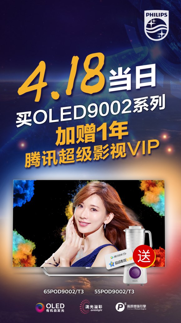 4月18日购买飞利浦OLED电视——POD9002/T3系列,除了冰点价和飞利浦搅拌机相送,还送价值600元的腾讯超级影视VIP,尊享海量优质内容。