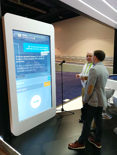 图说:2018年CES国际消费电子展上,阿里AI翻译展区的参观者进行实时翻译