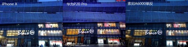 既然说到华为P20 Pro,咱们不妨来看看华为P20 Pro的大底在夜景中表现。根据样张我们能看出,三组照片中iPhone X的整体感观明显比华为P20 Pro和索尼A6000微单要差一个档次,特别是橱窗中的灯光已经出现了过曝。而华为P20 Pro和索尼A6000除了调色和局部细节略有差异外,整体表现差不多,都很棒。