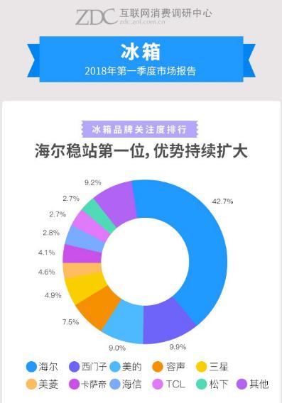 自年初欧睿国际公布海尔冰箱获得全球10连冠以来,海尔冰箱就赢得了媒体、用户以及行业的诸多关注。除《纽约时报》刊登世界冰箱业进入“中国时代”海尔领跑的消息外,近日,中关村在线互联网调研中心(ZDC)公布的2018年第一季度冰箱市场报告也显示:凭借唯一原创的全空间保鲜冰箱等优势产品,海尔冰箱在品牌关注度中占42.7%,稳居第1;冰箱产品关注度排行10强中,海尔独占6席,优势持续扩大。