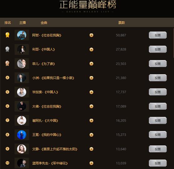 看到这里,各家粉丝团可以喜大普奔了!阿哲不负众望,以一首《壮志在我胸》登顶巅峰榜!当然,舞帝利哥、菲儿的实力也不容小觑,位列前三!小洲、毕加索、大佛、崔阿扎、王冕、文静以及蓝选李先生也成功跻身YY新时代十大正能量主播!据了解,YY直播将会把本次十大正能量主播的歌曲在站内外进行推广,向社会展示YY主播们的全新正能量风貌,也让网友感受到前所未有的正向内容体验!