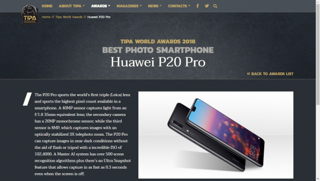 昨天晚上,华为终端官方微博传来好消息:华为P20 Pro 获得2018年度世界影像技术新闻协会(Technical Image Press Association,简称TIPA)“最佳拍摄智能手机”大奖,被认定为智能手机影像功能新基准的制定者。这也是华为连续第二年蝉联该奖项。