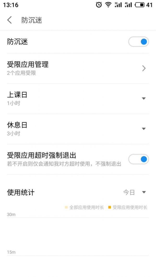 Flyme 7将安全家庭升级为家庭守护,加入儿童防沉迷的功能,守护的人群进一步扩大。父母可以利用儿童防沉迷功能将孩子手机中的某些应用设置为受限应用,限定其使用的时间,在超时时可以远程强制退出,让孩子有节制地玩游戏,保护其健康成长。