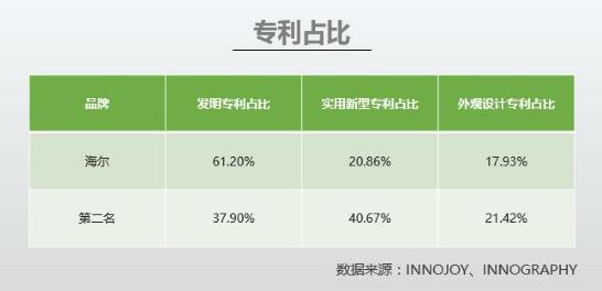 在科技含量最高的发明专利方面,海尔占比达到61.2%,证明海尔更注重专利质量。而另一家企业发明专利占比为37.9%。