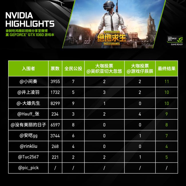 由NVIDIA于举办的Highlights PUBG创意视频大赛于4月29日完满闭幕,N粉们以自己的创新构思营造出各出新奇搞笑的吃鸡场景,使用NVIDIA Highlights/ ShadowPlay录制精彩视频并按要求将作品分享至新浪微博#ShadowPlay#话题@英伟达游戏即可参赛。本届大赛参赛作品质量非常高,经过全民公投以及大咖投票的累计,下面我们将公布比赛最终成绩。