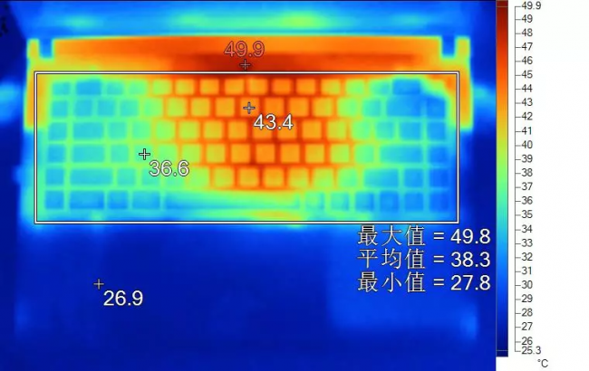 表面温度方面,高温区域面积中规中矩,但温度数值确实较低,键盘较热区域在中间靠上的位置,但也不超过45℃,有热感。