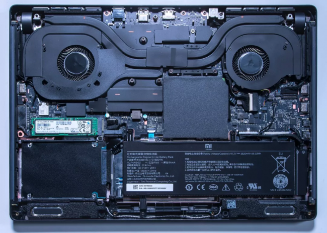 上图是小米游戏本的拆机图,听说小米游戏本的研发团队是戴尔+联想的前员工负责的,散热设计很成熟,内部涂黑+底面灯条的设计甚至有点ALIENWARE系列的感觉。
