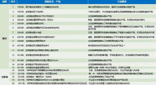 从洗鞋到洗衣,海尔洗衣机凭借多项原创科技成为行业竞相模仿的对象。1996年,海尔首创全球首台小小神童迷你洗衣机,填补世界微型洗衣机空白,随后行业相继推出同类产品;2002年,全球首创第四种洗衣机--双动力洗衣机,韩系、美系等百年品牌都相继推出类似产品,引领洗衣机技术换代;2014年,全球首创发明免清洗洗衣机,破解行业百年脏桶问题,主流品牌也开始模仿免清洗功能。
