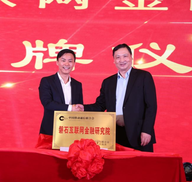 图:中国移动通信联合会执行会长倪健中、盘石董事长兼CEO田宁为磐石互联网金融研究院