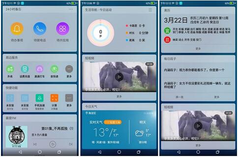 指尖轻划至左一屏,便是“省事儿4.1”主界面,多元化的定制服务能根据用户需求进行任意添加,其中生活导航中的路况功能非常实用,用户可根据自身情况设置起点和终点,以及出发和返回时间,并依托于高德导航的精准路况信息进行实时更新,计算出较为准确的路线与用时,让用户提前预知路况信息,避开高峰时段,降低出行的时间成本。在新闻资讯方面,内置的新闻与今日头条可根据用户日常的浏览偏好,并以简洁的智能卡片形式进行及时推送,让用户无需进入相应的APP也能阅览往日关注的相关新闻,若想阅读其他新闻,点击右下角更多选项,则会得到与网页信息一致的丰富内容,让用户轻松获取一手信息。在娱乐方面,内嵌的每日段子、直播交友、最爱FM,也可陪用户度过闲暇时光。