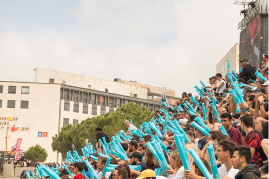 FISE法国站现场除了燃炸的极限腾空,最热闹的莫过于几十万观众的热情互动。他们都是席地而坐,头顶地中海的大太阳、手持蓝色的充气棒为比赛呐喊助威,已经将人山人海的现场变成了蓝色海洋。