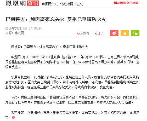 随后,民警接到报警电话后立即赶往现场排查,经查原系业主锅中炖着肉就出门买菜忘关火,导致锅内水分烧干发生火情。而这种情况并非特例,全国各地因为同样原因导致的厨房火灾还有很多很多。