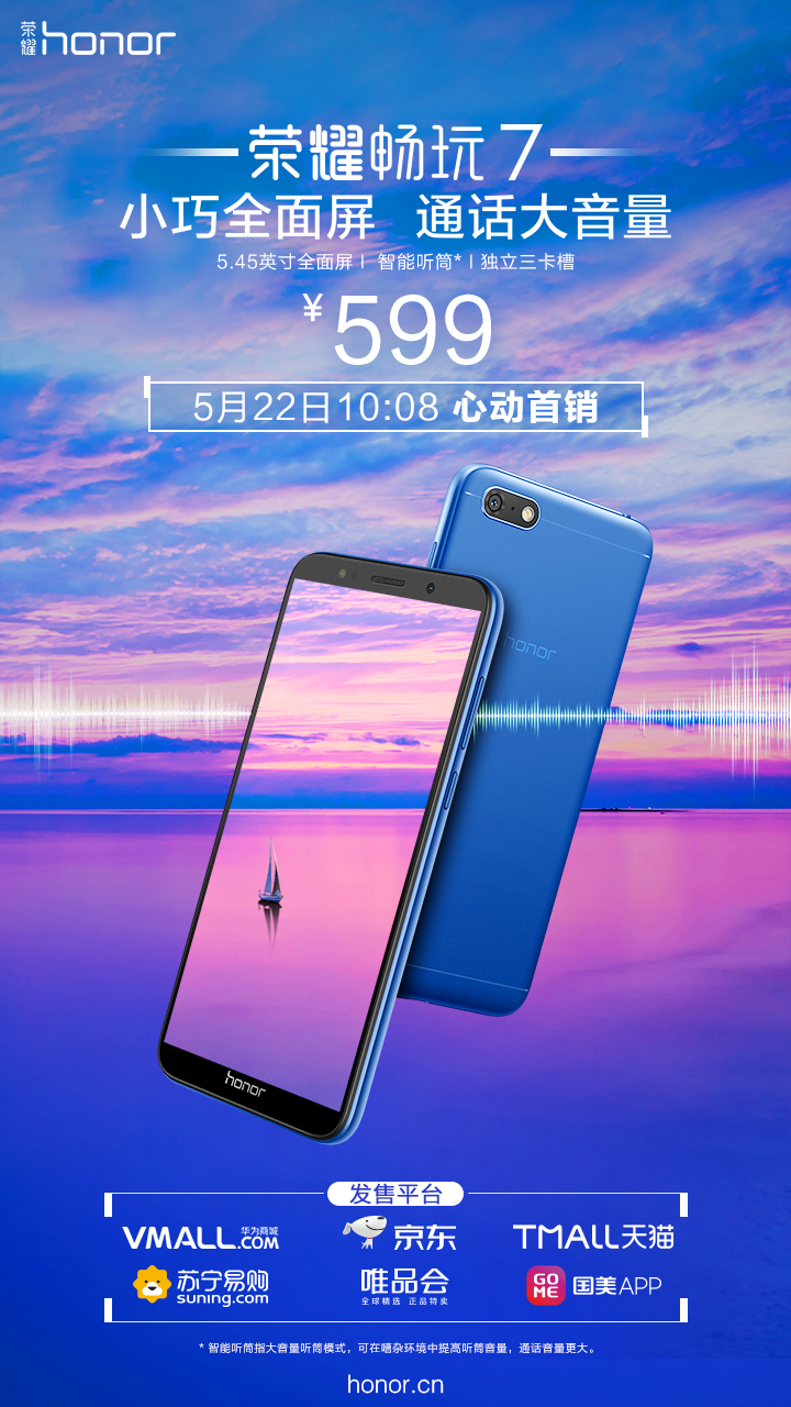 5月17日,荣耀品牌全新推出小巧全面屏,通话大音量的全新荣耀畅玩7,凭借5.45英寸全面屏、智能听筒、人脸识别和出色品质,以及仅售599元的价格,一经推出便受到媒体的极大关注。中关村在线、赛迪网、手机中国等10家科技媒体纷纷为其打Call,火爆程度可见一斑。而就在5月22日今天上午10:08,荣耀畅玩7正式开启了线上首销,首销平台包括:华为Vmall商城、天猫、京东、苏宁、唯品会、国美。