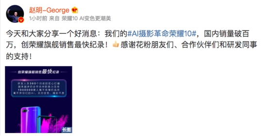 5月22日,荣耀总裁赵明@赵明-George发布微博:“今天和大家分享一个好消息:我们的#AI摄影革命荣耀10#,国内销量破百万,创荣耀旗舰销售最快纪录! ”正式公布荣耀10国内销量破百万,创荣耀旗舰销售最快纪录。