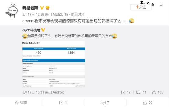 不止如此,此次的魅蓝6T在配置上也有不错的惊喜。魅蓝6T或放弃了高通和MTK两个成熟的处理器平台,转而采用了国产芯片制造厂商展讯的方案。在提倡大力发展国产芯片的今天,作为老牌手机厂家魅蓝也在用自己的实际行动支持国产芯片,这一点确实十分难得。据了解此次的魅蓝6T搭载的处理器采用了四核心的设计,主频达到了1.3GHz,通过被爆出的跑分数据,定位入门级的这款千元机在日常使用上应该十分流畅。