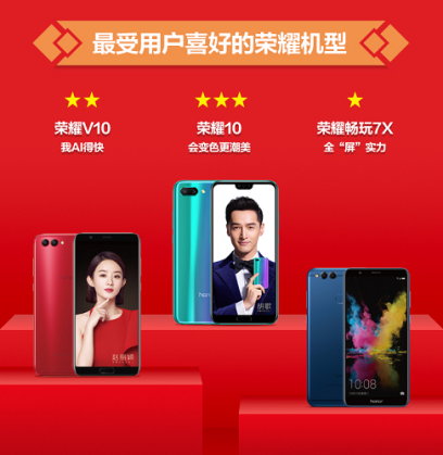 1、荣耀V10、荣耀10和荣耀7X拿下国美单品排行榜TOP3