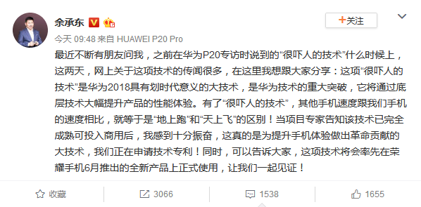 余承东在微博表示:这项“很吓人的技术”是华为2018具有划时代意义的大技术,是华为技术的重大突破,它将通过底层技术大幅提升产品的性能体验。字里行间难掩骄傲和喜悦之情。考虑到技术创新一直以来是华为最为鲜明的一个标签,即便是在全球范围内,华为的专利申请数量也是名列前茅,不难推断,此次推出的技术应该非同一般。