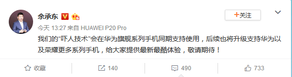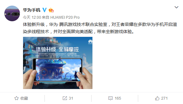 不知是巧合还是有意为之,就在今天,@华为手机 官微也对外宣布“华为•腾讯游戏技术联合实验室,对王者荣耀在多款华为手机开启渲染多线程技术,并对全面屏完美适配,带来全新游戏体验。不知道这个优化是否和即将面世的“吓人技术”是否有关。