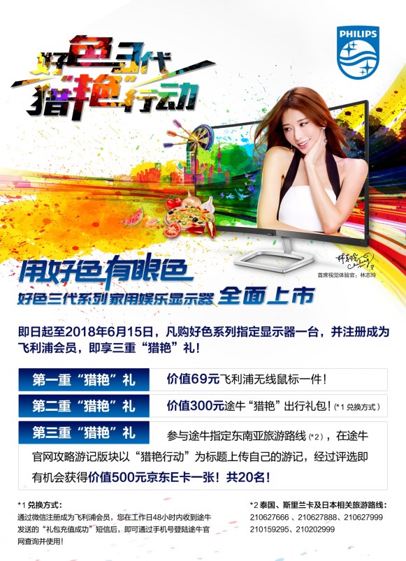 飞利浦全新第三代好色系列显示器内外兼修的优秀素质让不少人都倾慕不已,在人性化设计这一方面,通过LowBlue技术,通过软件技术抗蓝光,还有飞利浦Flicker Free不闪屏技术,利用DC调光,解决不易察觉的屏闪现象,呵护用眼健康。是不是已经等不及想要入手一台,体验一下身临其境的观看体验了呢?不要着急,全新好色三代显示在全国授权实体门店已全面上架。即日起至2018年6月15日,凡在全国授权实体门店购好色系列指定显示器一台,并注册成为飞利浦会员,即享三重“猎艳”礼!