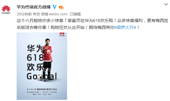 虽然才到五月底,但全国各地区升温的速度明显,与气温上升一样迅速的还有人们对于6.18年中电商狂欢节的热情。在电商狂欢节中最受消费者关注的当属数码类产品,为了回馈消费者,各大厂商也使出浑身解数吸引眼球。就在昨天一张以梅西为主人物视觉的618海报曝光,更有诸如梅西签名球衣、爆款、秒杀、红包等福利来袭,相信大家都已知道刚刚说到的就是人气正旺的华为618欢乐Goooal活动,这次梅西要携手华为手机带你#眼界大开#!