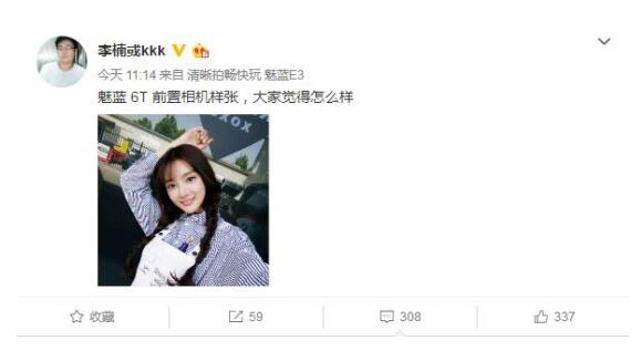 而就在发布会的前一天,李楠又一次在微博晒出了魅蓝6T前置摄像头所拍摄的妹子照片,效果真心不错。更是增加网友们对于魅蓝6T拍照实力的期待。