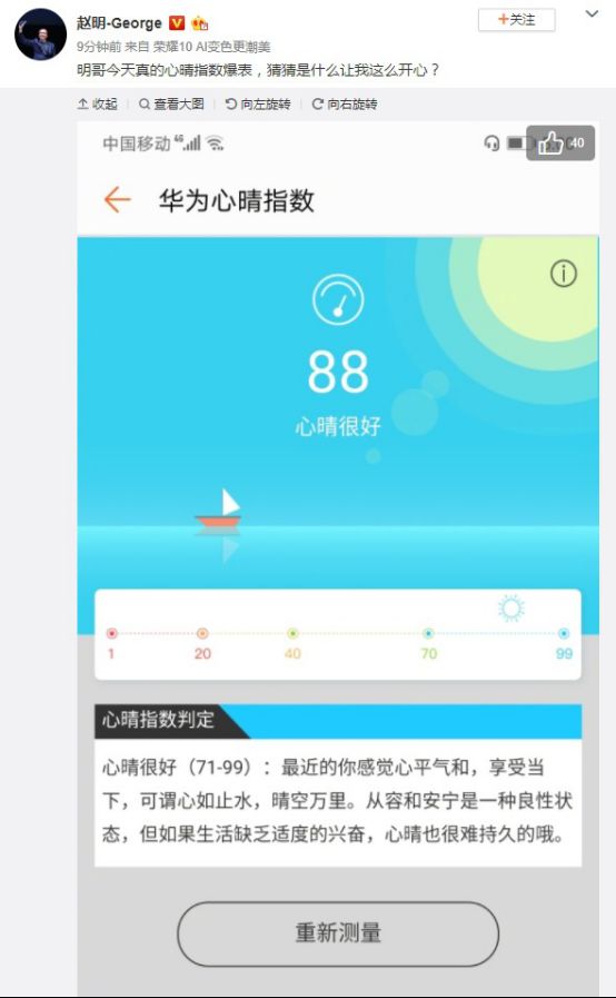 荣耀心晴耳机的“读心黑科技”在过去一周引发了广泛讨论。前有荣耀官微每天准时晚安博放出系列海报,展现不同的“心晴指数”;后有荣耀总裁赵明亲自发微博,晒自己的“心晴指数”截图。而“心晴”关键词这无疑与如今公布的“荣耀心晴耳机”名称完美呼应。在此前放出的海报中,我们还能够看到类似心率曲线的设计元素与心形元素组合出现,这个小细节也似乎暗示了荣耀心晴耳机还将具备“心率检测”的功能。如果真是如此,倒也能够解释为何这款耳机的外观设计有些与众不同了。