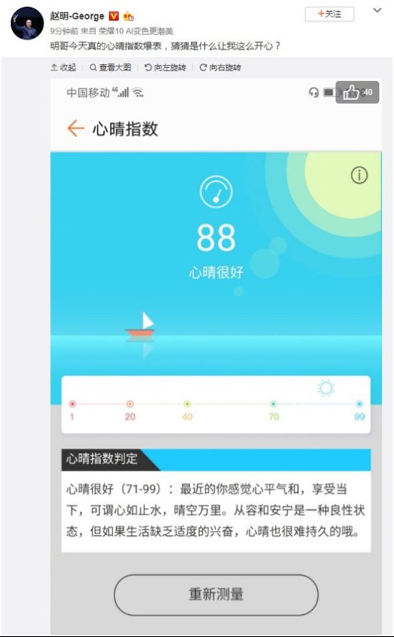 在此前的官方预热动作中,我们已经初步了解了荣耀心晴耳机的主打卖点——心晴指数评估。根据荣耀总裁赵明在微博发布的截图来看,荣耀心晴耳机能够将用户的“心情”换算成“心晴指数”,并针对用户当前的“心晴指数”给出简单的分析。看来,荣耀心晴耳机不仅仅是一款高颜值的百搭单品,同时还是一款懂你知你的“读心”神器。