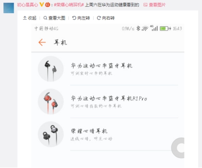 随后,荣耀花粉们也在华为运动健康app中发现了更多线索。根据荣耀花粉截图爆料,上周六,华为运动健康app中出现了“荣耀心晴耳机”,可选择与手机进行匹配。而其他两款可绑定手机的耳机产品均为运动心率耳机,这也令网友猜测荣耀心晴耳机是否也将是一款支持心率检测的耳机产品。