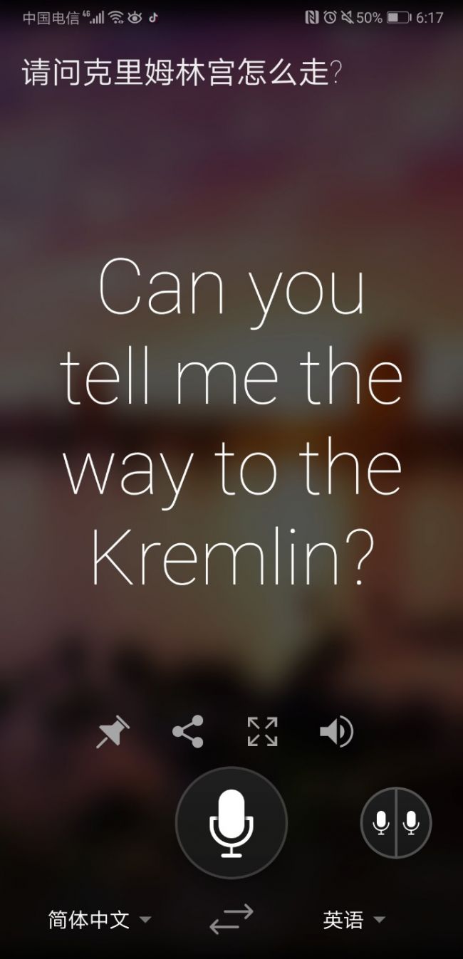 无论是在俄罗斯,还是其他国家,出国旅行是最常见的场景是,需要打出租车指出目的地、向当地人问路、酒店登记、餐厅就餐、购买物品等等。使用华为P20 Pro的AI随行翻译的语音互译功能,可以实现双方的无障碍沟通,而英语应该是世界通用语言,特别是在服务类相关领域。