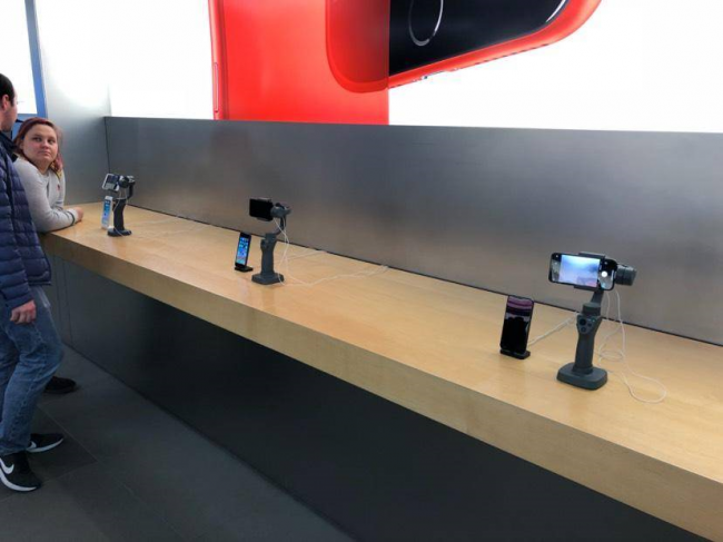 据苹果店员说,全球 503 家 Apple 旗舰店都在重要位置摆放了 Osmo Mobile 2。苹果店内还会有一些教用户用手机进行摄影摄像的培训课程,其中 Osmo Mobile 2 是出镜率最高的配件。