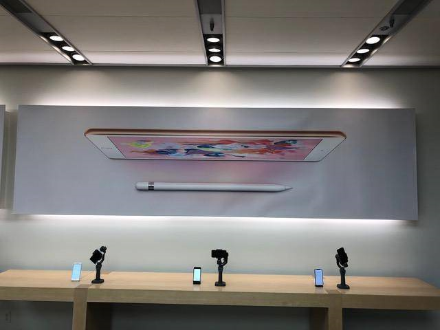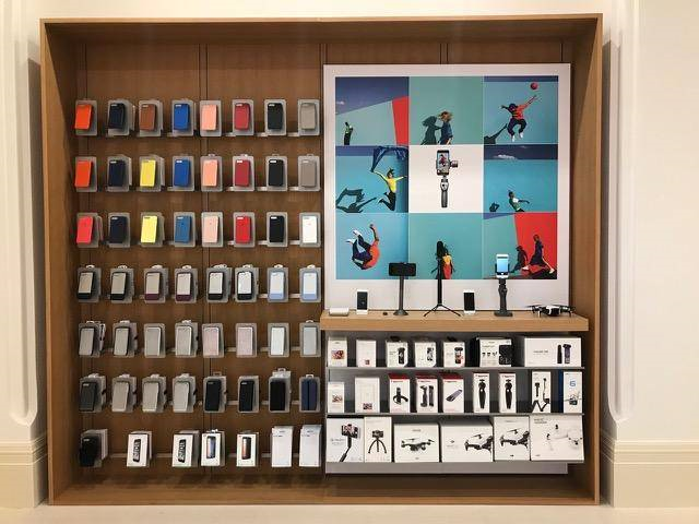 在苹果店里的陈列能看出,Apple 对 Osmo Mobile 2 有多喜爱。最新款的手机搭上最好的配套设备,还放在核心位置,并且有三台试用机器,店内的员工也会上前介绍手机与云台搭配使用的操作。再往配件陈列区走走,还能看到 Osmo 与 iPhone 进行拍摄的广告。