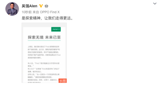 在题为《探索无境,未来已至》的微博长文中,OPPO副总裁吴强透露,OPPO对于Find有过太多领先和超前的构想,但直到今天Find X才达到了OPPO对于至美的要求。吴强在长微博中表示:“OPPO Find X足够美、足够让我们的团队描述它的时候手舞足蹈兴奋不已、也足够让我们有自信,确信它足够打动你们”。