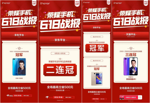 同时,“潮美旗舰”荣耀10更是在6月1日-6月3日获得天猫平台2000-2999元档手机品类销量三连冠,在6月3日,荣耀9青春版也荣获天猫平台1000-1499元手机品类单品销量冠军称号。