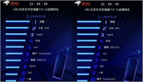 荣耀618促销活动开启不到一周的时间,就已经取得了傲人的成绩。分别在6月2日和6月3日的京东手机销量排行榜上位居榜首。在618活动开始的第一天1小时内,荣耀手机就摘得手机品类销量冠军的称号,6月2日-6月3日,荣耀手机获得京东平台手机品类销量两连冠。