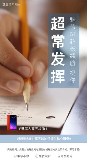 往届魅族在高考都有相关活动,之前就有「高考613分,就送魅蓝手机」,和高考高校给考生送水,今年也有相应的活动。这是魅族连续第三年为考生提供便捷服务,去年这个时候,魅族一线官博宣布,魅族2000+专卖店免费为家长和考生提供充电、饮水、电话、上网、交通指引等服务。今年也不例外,高考期间,只要你走进附近的魅族高考服务站、魅族专卖店及专柜,就可享受:免费饮水、免费充电、乘凉小憩等多项贴心服务。