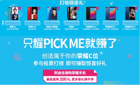打榜之前,参与者可从上面7款荣耀机型中挑选1款,并告诉工作人员支持的荣耀机型。然后在活动指定区域完成套环游戏,套中便可为支持的荣耀机型增加人气,还可获得惊喜礼品。“只耀Pick Me就赚了”打榜活动将在迪信通北京十里堡店、迪信通武汉亚贸店和迪信通宁波天一店三家店开启,当地的小伙伴可别错过。