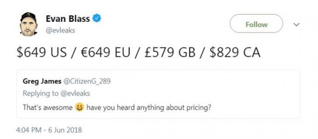 近日爆料大神Evan Blass在Twitter表示,黑莓KEY2智能手机在美国售价为649美元(欧版售价为649欧元),比去年首次推出的KEYone售价高出100美元,意思就是说,如果同样的价格放在国内的话至少也贵了700-800元(含税)。在黑莓KEY2的国外价格曝光后,网友也开始纷纷猜测黑莓KEY2在国内的售价,“会是4999元吗?”