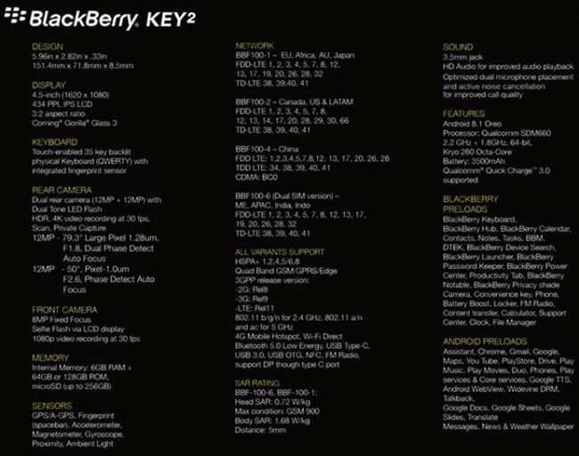 值得一提的是,外媒已提前曝光了黑莓KEY2具体配置:采用4.5英寸屏幕,物理全键盘则拥有背光和指纹功能;搭载骁龙660处理器,6GB内存,拥有64GB和128GB可选存储,运行Android 8.1系统;KEY2还配备1200万+1200万像素后置双摄,能以每秒30帧拍摄4K视频。看起来,黑莓KEY2还是值得期待的。