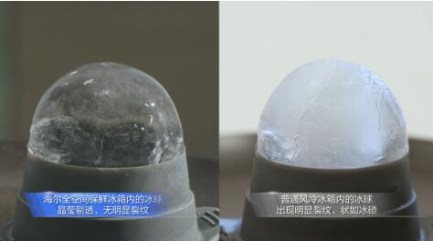 据悉,冰箱的冷冻室温度基本都在-18℃左右,这是因为按照国家相关标准规定,三星级冰箱冷冻保鲜标准为-18℃。当温度降低至-18℃时,水在冰箱内被冻成完整的冰球。但实际上,普通风冷冰箱内部由于冷冻室风道无法关闭,其在化霜时会出现10℃以上温度波动,我们肉眼无法观测到,冰球的密度却会随温度升高而变大。普通风冷冰箱冷冻室内温度升得更高,冰球内冰晶间体积增加的幅度会大于恒温冷冻的冰球,受到的挤压作用更大,造成了冰球出现断裂和裂纹。