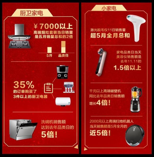 1日开门红所体现的消费升级趋势,在11日品类日再次得到印证,传统家电品类的高端产品及新兴改善型家电品类,都实现了几何式增长。