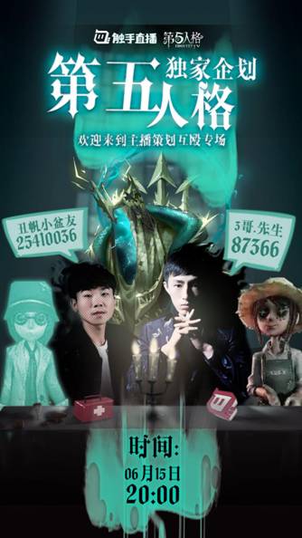 如果你也想加入此次独家企划,关注新角色在触手直播和《第五人格》策划手中的演绎,请于6月15日晚20:00锁定触手直播平台1214房间,海量福利等你来拿!