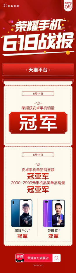 6月13日,荣耀手机还一举拿下天猫安卓手机销量冠军。荣耀10拿下安卓手机单品销售额冠军,荣耀Play、荣耀10拿下2000~2999元价位段手机品类单品销量冠亚军。