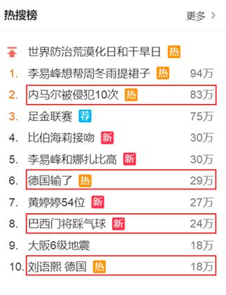 世界杯第四日,卫冕冠军德国队被墨西哥1比0击败,五星巴西被瑞士1比1逼平。两大夺冠热门双双爆冷,让广大球迷、泛球迷深感这届世界杯“寒意袭人”。“天台快站不下了”、“世界杯最冷的一夜,你在天台还好吗”成为了流行语。而“内马尔被侵犯10次”、“德国输了”纷纷登上微博热搜榜,再次显示出世界杯的超高话题性与关注度。