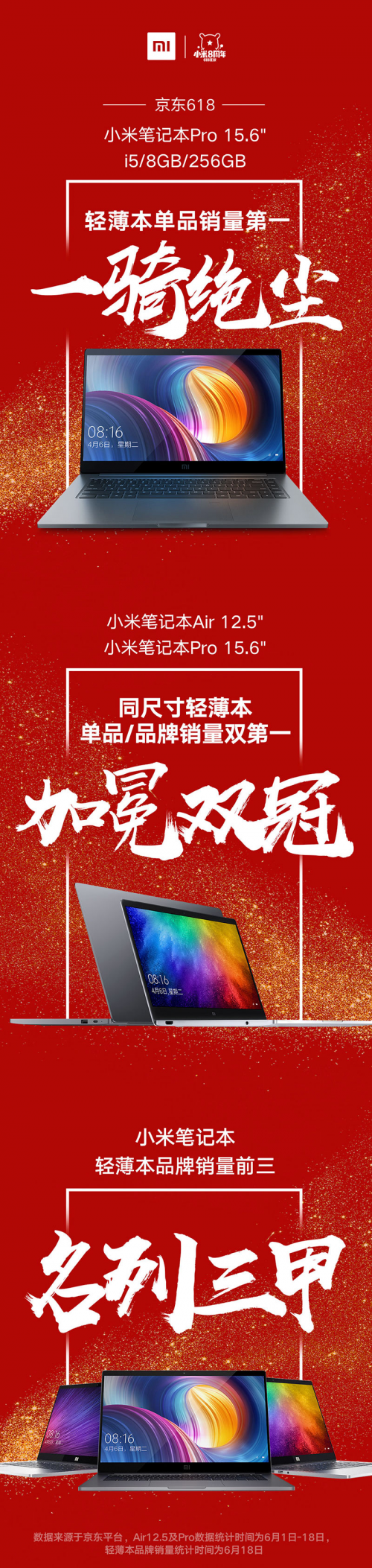 历时18天的618大促缓缓落下帷幕。今年618,小米笔记本的表现十分抢眼。据其最新战报及京东排行数据显示,以小米笔记本Air 、Pro为代表的小米笔记本获得了众多用户的踊跃抢购,帮助小米取得了京东轻薄本单品销量冠军及轻薄本品牌销量第3名的好成绩!