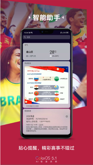 OPPO ColorOS系统考虑到了球迷们的需求,专门为本届世界杯推出了定制功能「热点资讯」卡片。开启手机后,在桌面主页随时向右一划,就能唤出智能助手。
