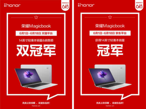 荣耀Magicbook获天猫平台14英寸笔记本销量及销售冠军双冠军、京东平台销量冠军。