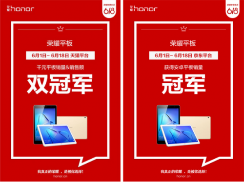荣耀平板获天猫平台千元平板销量&销售额双冠军、京东平台安卓平板销量冠军。